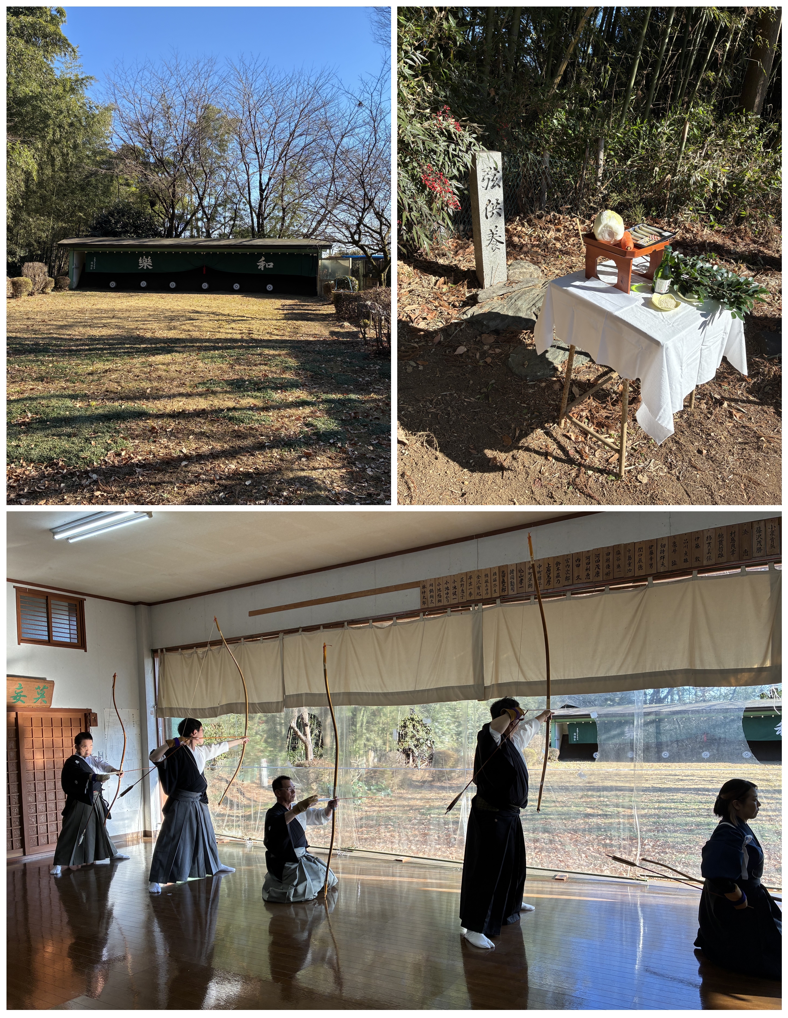 みんなで手入れした和楽館弓道場で、年末には恒例の研修会と納射会を行います。