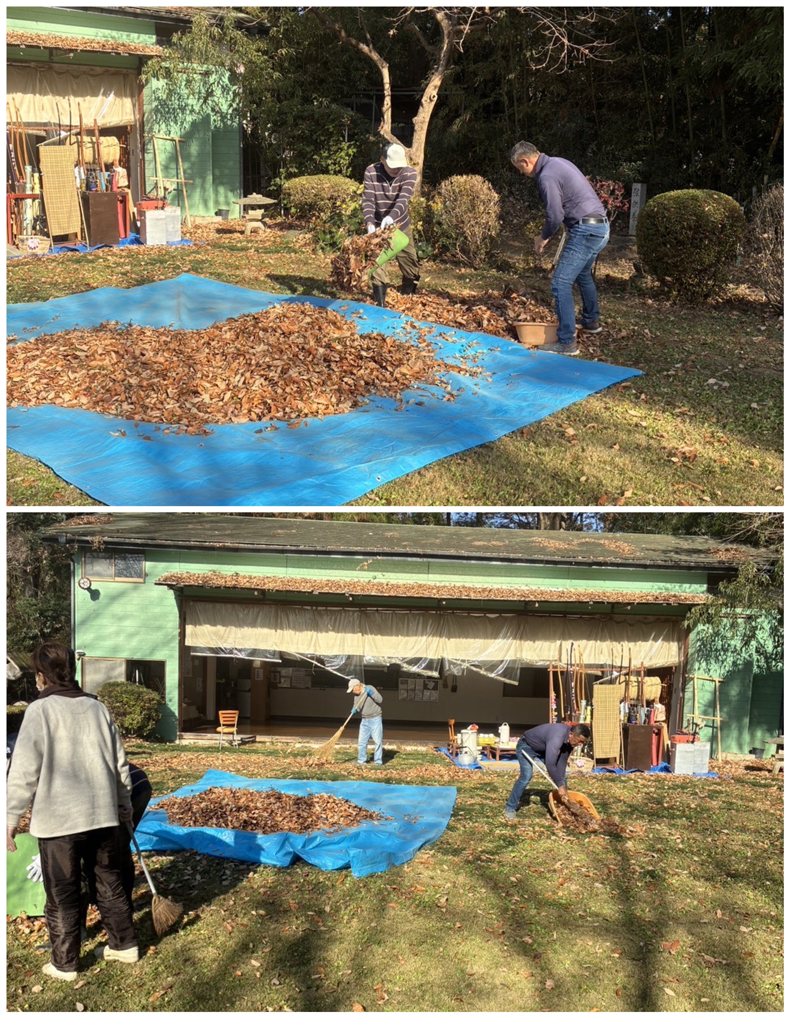 年末の大掃除を行いました。晴天で暖かく、風のない穏やかな日で早朝から道場内の片付けとワックスがけ、矢道や周囲の枯葉の片付けなど行い、午前中には無事に終える事ができました。